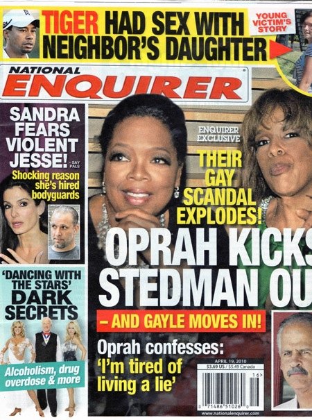 This afternoon when Dad and I were buying groceries, I noticed the National Enquirer’s headline that Oprah has ordered Stedman out and moved Gayle King in because she’s “tired of living a lie.”