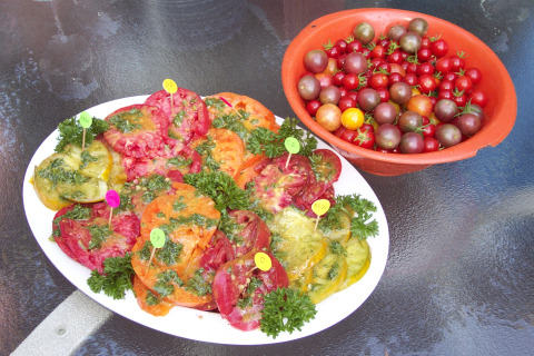 Sliced heirloom beefsteak tomatoes and a bowl of heirloom cherry tomatoes, all from the container garden of Cynthia Yockey from 2007.
