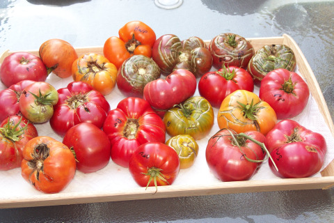 In the plate of sliced tomatoes, the green ones on both sides are Aunt Ruby’s German Green. The red ones on the left with the pink tag are Stump of the World (a religious reference to Jesus). The pink ones on the left with the yellow tag are Prudens Purple. The red ones on the left are both categorized as black tomatoes: Carbon in the front and Cuban Black in the back with the green tag.