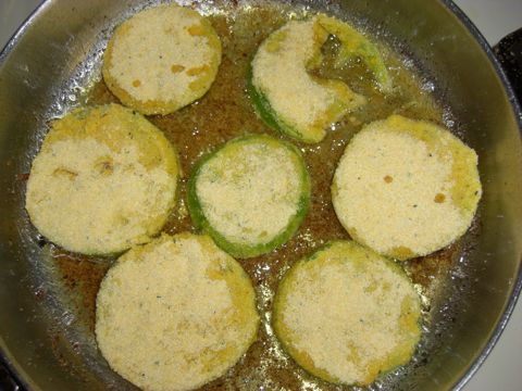Tip: some of the cornmeal coating will fall off the tomatoes as they fry. To keep that cornmeal from burning and making subsequent batches taste bad, when it starts to brown, pour out all the oil and cornmeal and wipe out the pan. Then add fresh oil or ghee and let it heat up again before adding more green tomato slices.