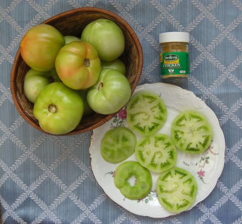 - Using the proportions above for the number of tomatoes you plan to fry, mix the corn meal, no sodium bouillon and pepper in a measuring cup, then pour some out on a plate.
