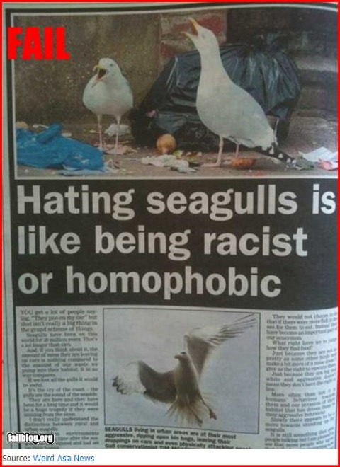It’s called ‘gullism’ Posted byCynthiaYockey July 27, 2010July 27, 2010 1 Comment on It’s called ‘gullism’ Stop the hate: It's called 'gullism' -- stop the hate. From FailBlog.