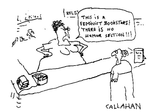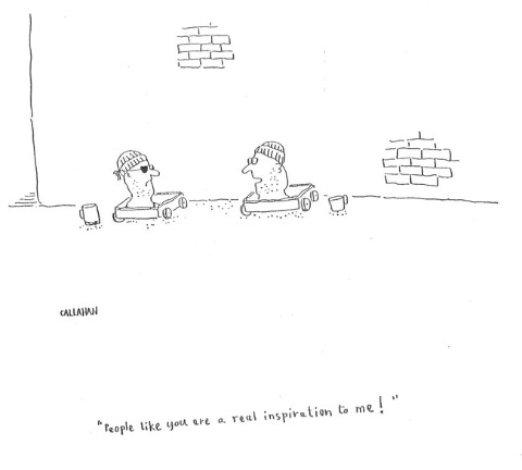 Update, 7/28/2010: I guess it makes sense that dear, irreverent Kathy Shaidle also was a fan of John Callahan’s. Do go to her place and read what she’s got, but also check out a story she links with the great headline, “Tales from the Crip,” especially if you were wondering about who dyed his hair. It’s not the kind of thing you notice unless you’ve lived with quadriplegia, but Callahan did NOT have the most appropriate wheelchair for his mobility, so it’s no wonder the one he had hurt his back and required him to be bedridden most of the time — he should have been in a tilt-in-space/recliner chair with electric leg lifts. Then he could have changed positions for pressure relief.
